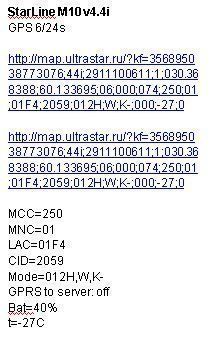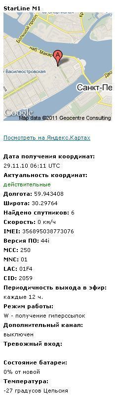 Сообщение приходит в виде гео-координат или в виде ссылки на карту. Перейдя по ссылке можно открыть карту (map.yandex.ru или map.ultrastar.ru) с указанием точки расположения автомобиля. Можно определить контрольную зону, где может находиться автомобиль, и StarLine M30 будет присылать SMS сообщение, когда например ваш водитель вместо положенного ему маршрута, поедет по своим делам. Или будет превышать допустимую скорость при доставке ваших детей в школу. В StarLine M30 устанавливается SIM карта МТС, все сообщения платные, стоимость зависит от конкретного оператора, но небольшой суммы денег в 200 рублей должно хватать на год нормальной работы. При этом есть возможность узнать баланс или запросить уровень приема сигнала GSM.