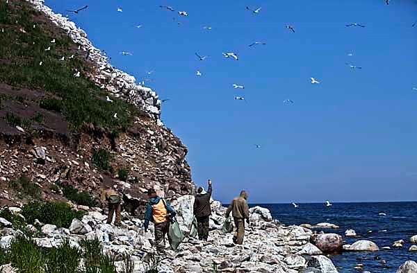 Прослушав краткий инструктаж и надев перчатки, путешественники приступили к работе. Шли аккуратно, ведь на земле гнездились чайки, и тут, и там попадались их яйца или уже вылупившиеся птенцы, которые прятались в траве и находили приют рядом с небольшими камнями, подчас полностью сливаясь с ними. Над головами участников автоэкспедиции кружили их родители, они громко переговаривались и ревностно следили за каждым шагом волонтеров. Я склонился над одним из гнезд и на фотоаппарат зафиксировал кладку из трех яиц. В это же время ко мне подошел Женя Бабушкин. В руках он держал саперную лопатку.