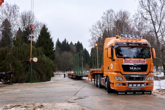 Уже не первый год подряд компания «ИнСпецКом» является надежным перевозчиком главной елки страны на Соборную площадь Кремля. В этом году уникальная операция по транспортировке 27-метровой новогодней ели осуществлялась при помощи специального автопоезда в сцепке с седельным тягачом MAN TGX 6x4 мощностью 540 л.с.. Автопоезду, суммарная длина которого приближается к 40 м, необходимо было преодолеть около четырех десятков километров по дорогам Московской области, а также маневрировать на улицах российской столицы.