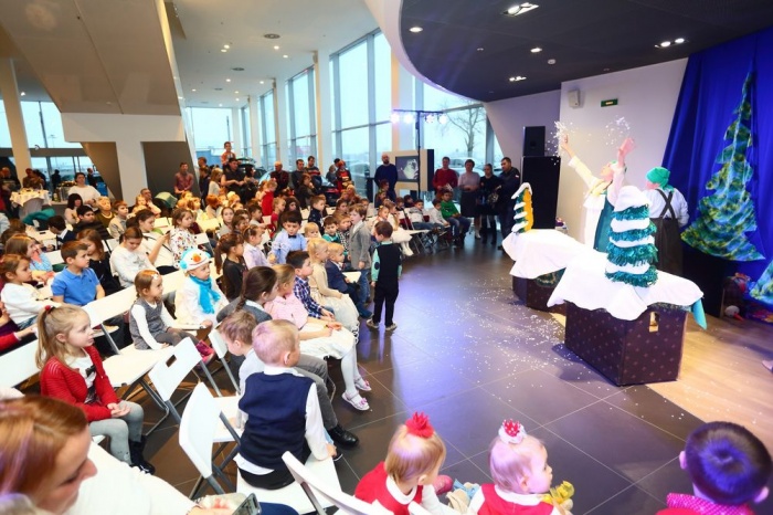 Самым интересным и долгожданным подарком для маленьких гостей стал кукольный спектакль «Морозко», для которого дилерский центр превратили в театральную площадку.