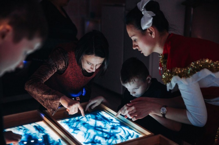 белоснежная светящаяся Ведущая-Ёлочка, новогодняя музыка, яркие воздушные шарики, волшебное занятие с песком на световых панелях, создание новогодних игрушек своими руками, вкусные и красивые угощения.
