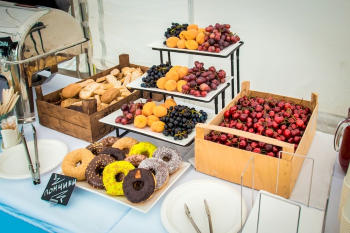 И, конечно, насладиться вкусным фуршетом с ягодами, фруктами, десертами и горячими блюдами, приготовленными на гриле.